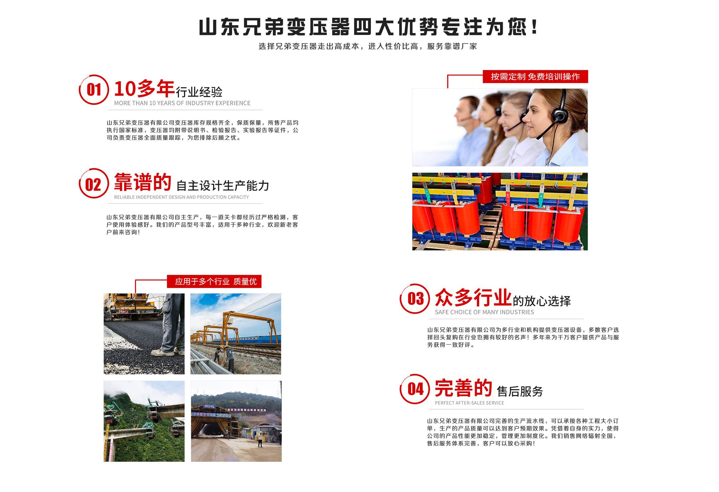 山東兄弟變壓器有限公司經營SCB10干式變壓器,SCB11干式變壓器價格,SCB12變壓器,SCB13干式變壓器,SCB14干式變壓器,SCB18干式變壓器等產品及用戶要求的特殊變壓器。 公司的質量方針是:“顧客的滿意,是我公司的追求?!眻猿仲|量,用戶至上,以質興業,以優取勝,愿為廣大用戶設計各種要求的變壓器,以求共同發展?! ∑髽I精神:“創新、求實、誠信、高效”?! ∑髽I作風:“嚴、細、實、快”。 企業工作方針:“加強內部管理,夯實基礎,全面提高職工整體素質,使企業管理水平再上新的臺階”?! 」?..